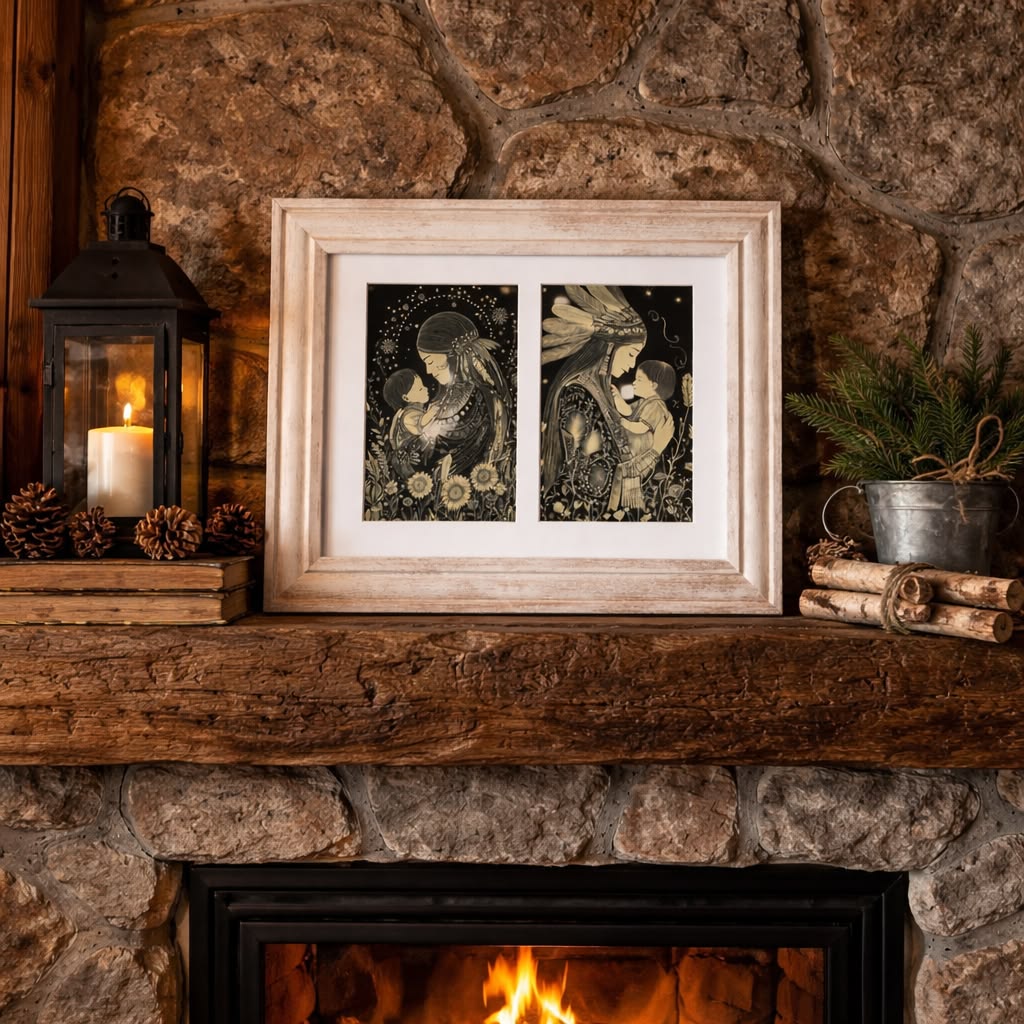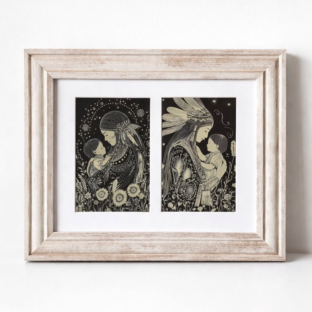 Beautiful decorative wall art featuring two delicate and emotional illustrations of a mother holding her child, inspired by spiritual and tribal symbolism. The artwork is set against a dark background with botanical and celestial elements, creating a dreamy, intimate and soulful atmosphere.