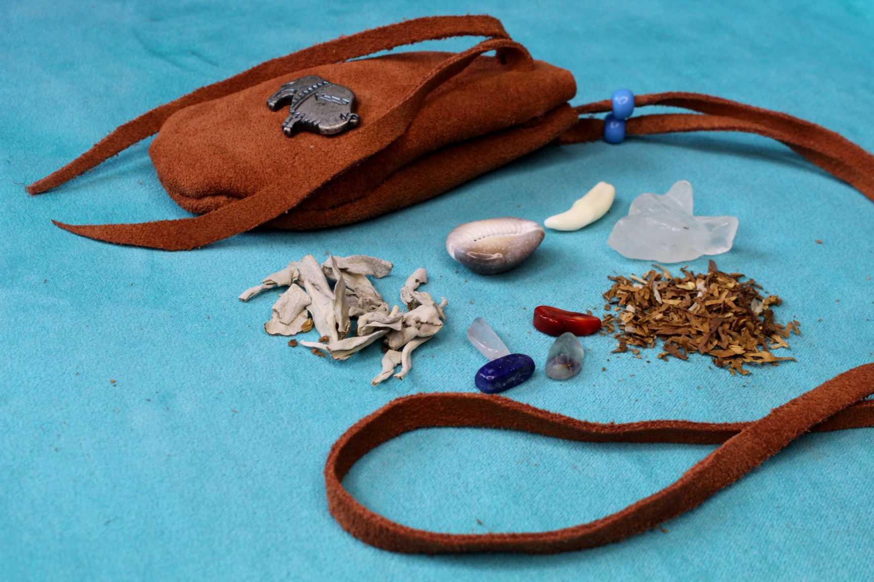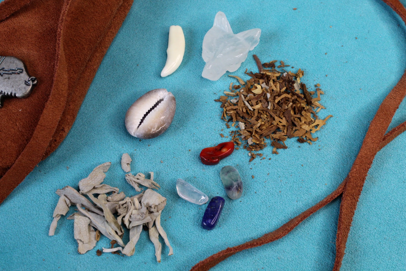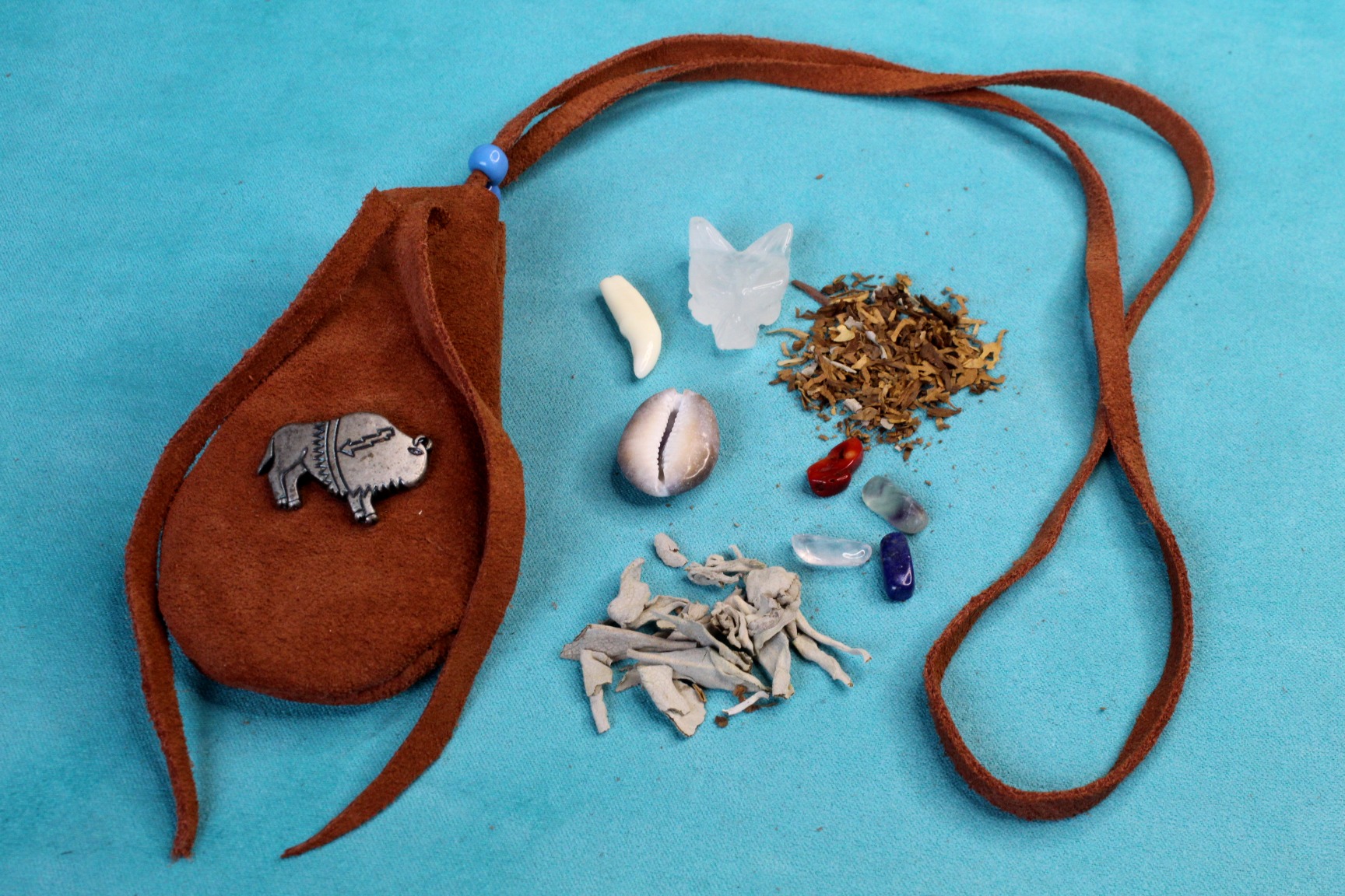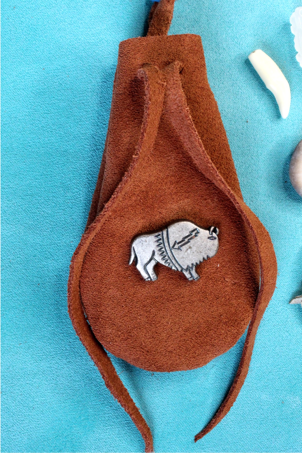 Calfskin medicinal pouch with buffalo concho. This pouch, handcrafted according to tradition, contains authentic fox fang, a selenite-carved wolf’s head, California white sage, Virginia tobacco, cowrie shell, lapis lazuli, rose quartz, fluorite, and red coral. The pouch measures 10 x 6 cm (4 x 2.5 inches).