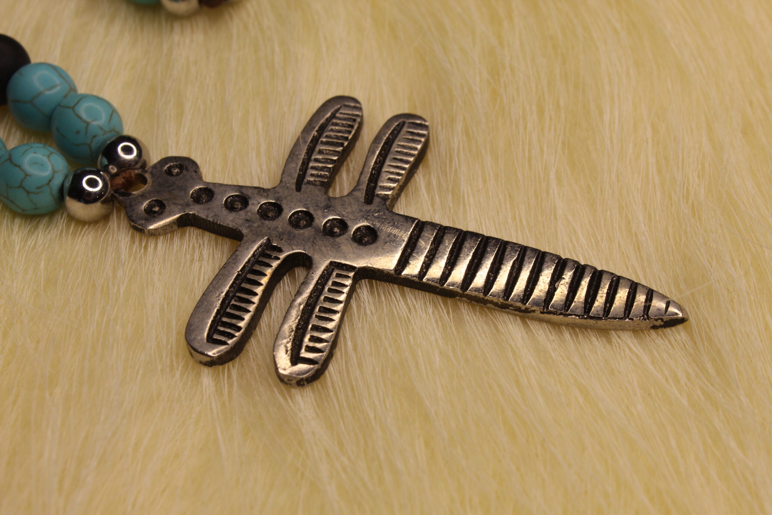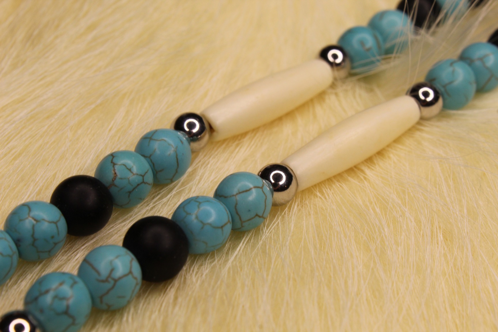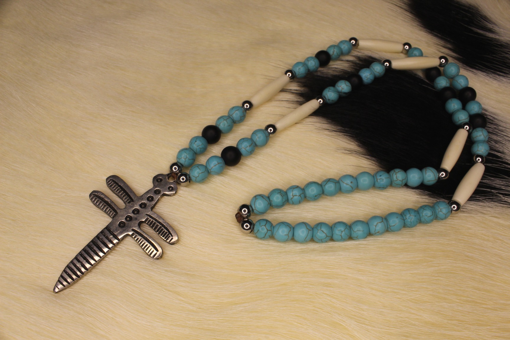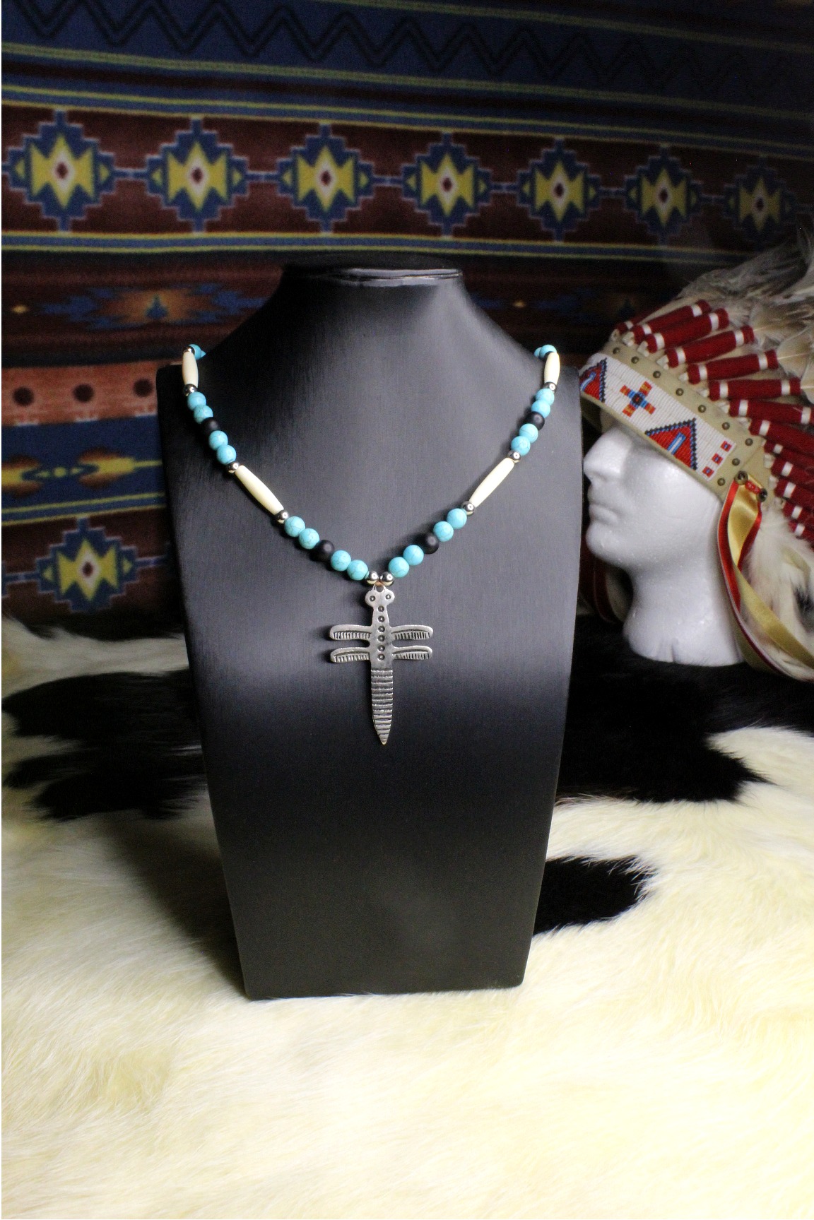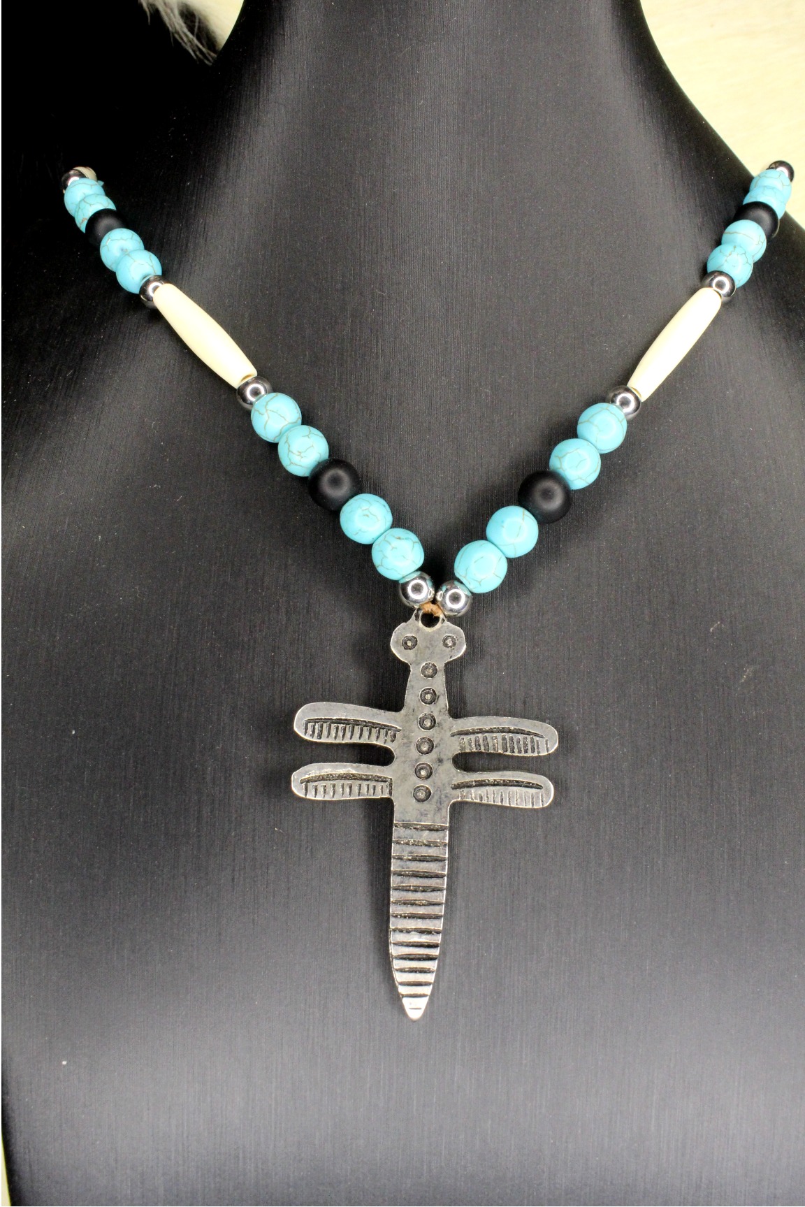 Handmade pendant, antique style, with alpaca, blue howlite beads, buffalo bone, and stainless steel beads.