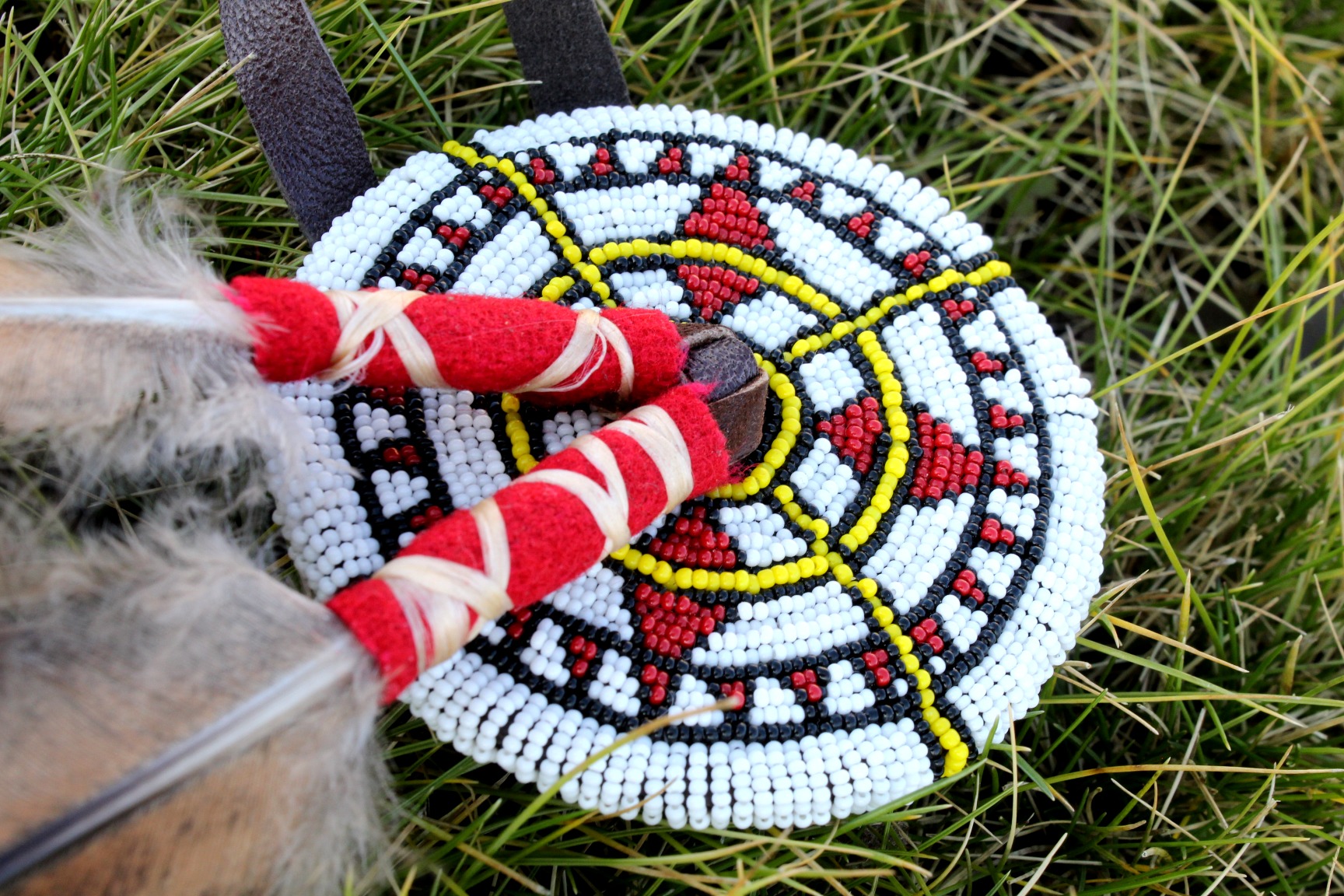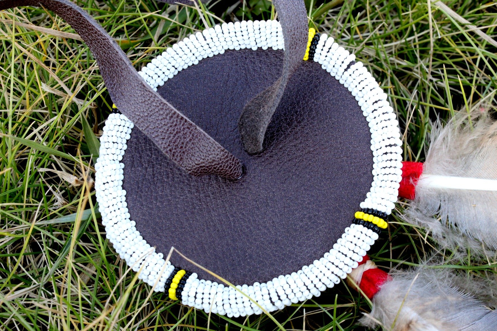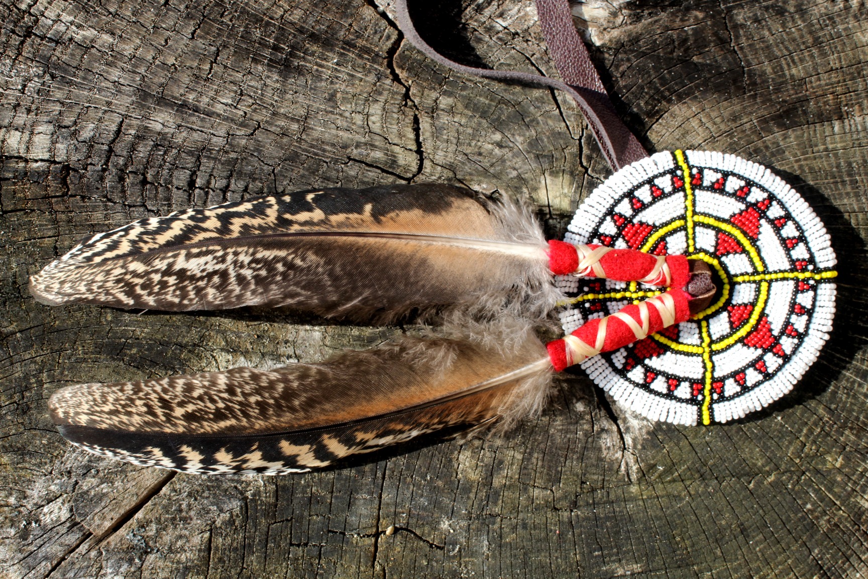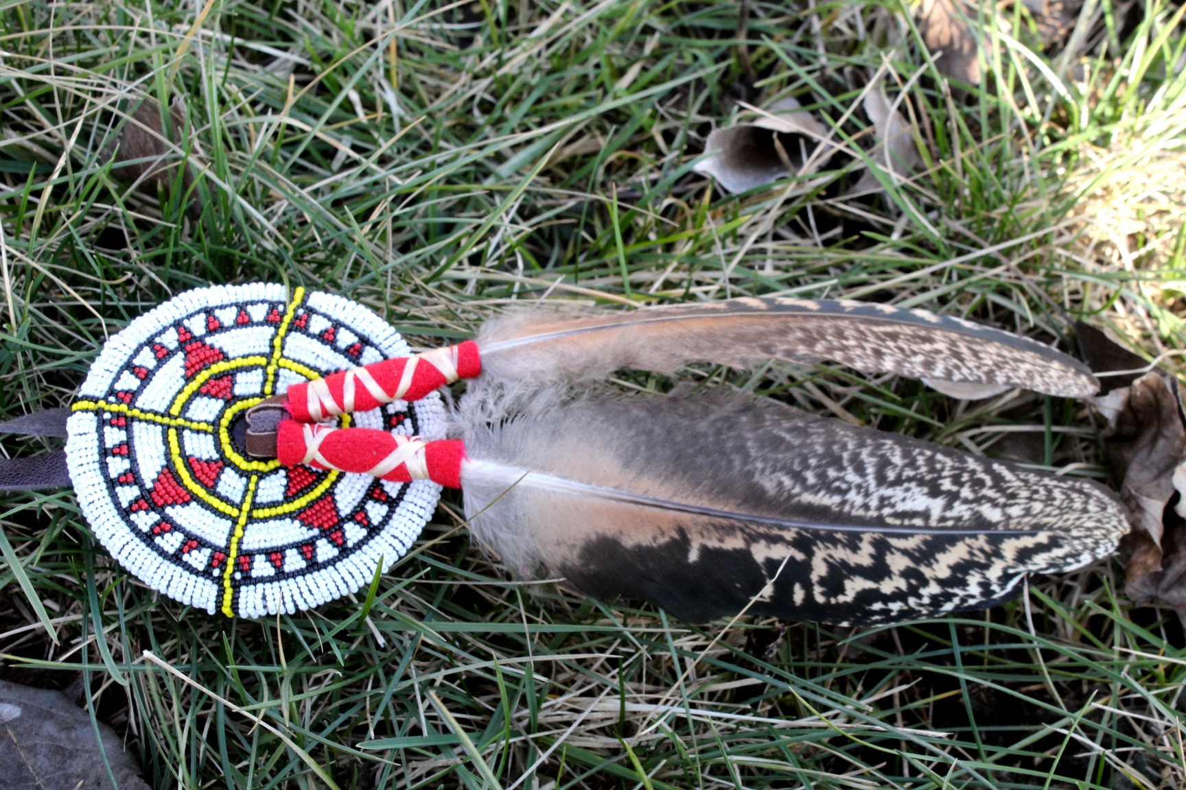 Traditional Lakota style hair tie with beaded rosette and two falcon feathers. Handcrafted leather rosette, rosette measures 8 cm (3″ inches) and feathers 19 cm (7’5″ inches). Total hair tie measures 23 cm (9″ inches)