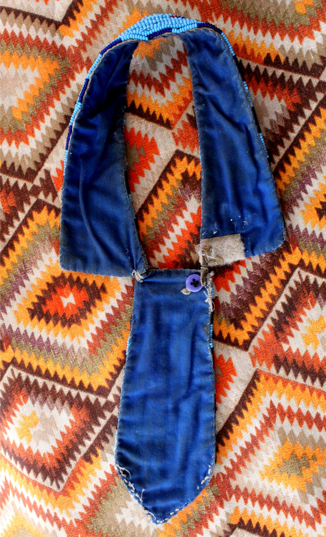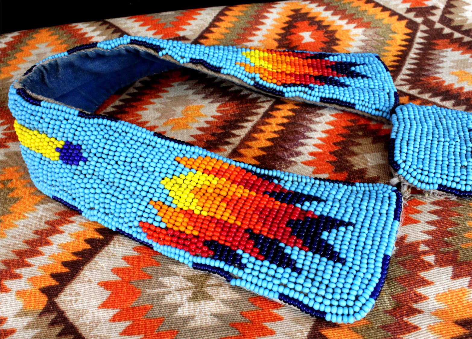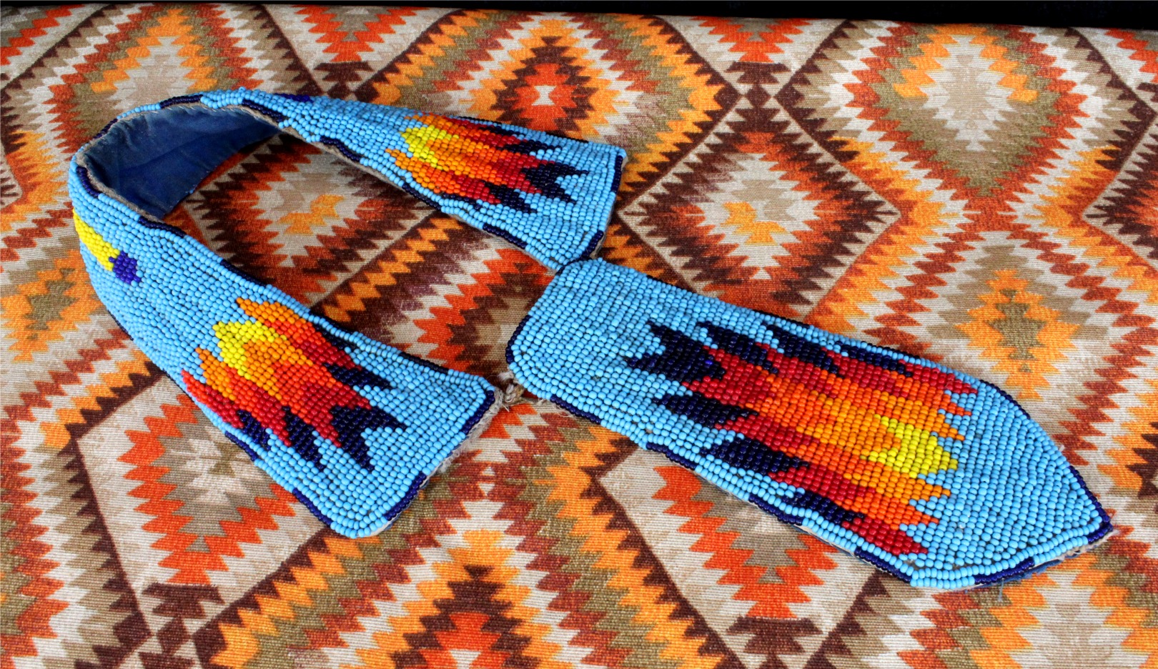 Traditional beaded Lakota tie. This is a special piece that was used for many years in the Bear Thunder family at Pow Wows since 1976. Recommended for a collar with a diameter of 11cm (4.33″ inches). The tie measures 17x7cm (6.69″x2 .75″ inches) and the necklace is 36cm (14.17″ inches).